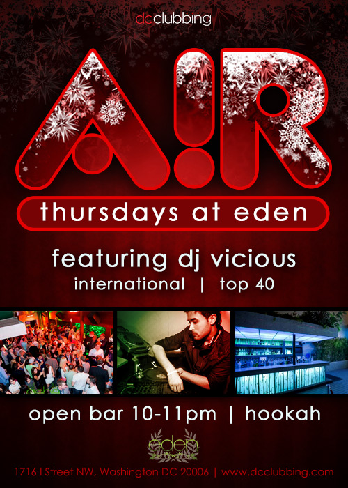 ‘Tis the season to enjoy some AiR at Eden – what better way to spend your Thursday night than on Eden’s Rooftop! Join us for great music, drink specials, and great time (not to mention a heated rooftop). Don’t be stuck inside partying and missing out on DC’s best Thursday night party!