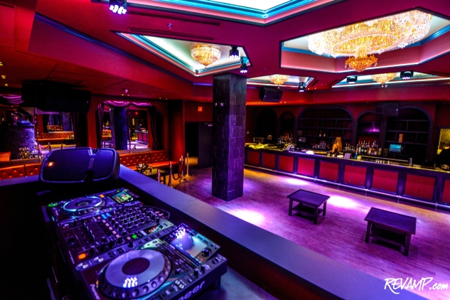 Step into the main room (Ballroom) and you are greeted by 14 foot finished ceilings, crystal chandeliers and ample dancing room encircled by VIP tables. Mirrors are surrounded by curtains to complete the “ballroom” look while a raised DJ booth provides an unimpeded view of the DJ from the crowd. The staff is efficient but friendly.