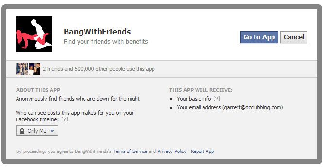 The app has been awarded “Terrible App Idea of the Week” by Forbes, but what could be wrong with a “completely private and discreet” app where words with friends and the Craigslist Casual Encounters section meets? Well.. besides the obvious reasons having sex with someone coordinated via an app titled “Bang With Friends” might not be a great plan. There’s this problem with facebook where nothing is really all that private or discreet: