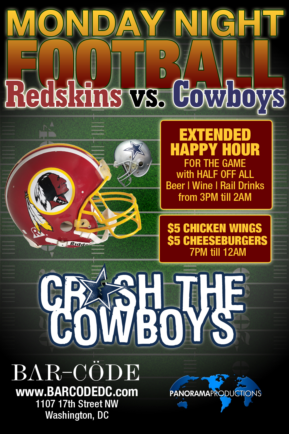 Barcöde will be showing the game of course. With 2 70″ projectors and 10 42″ HDTVs you won’t miss a second of any Monday Night Football action. Refreshments will include an extended happy hour until 2AM with half off all beer, wine, and rail drinks. If food is in your forecast $5 cheeseburgers and wings are available and the full menu is available every day until midnight. Reservations are available, call 202-955-9001 to carve out your spot for lunch, dinner, or bottle service.
